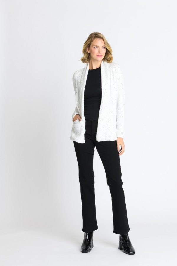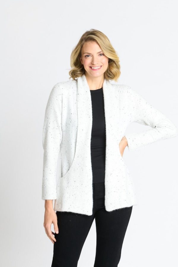 The Flecked J-Pocket Cardigan Sweater features super soft and cozy yarn with speckled black donegal detail and convenient j-pockets. This lightweight cardigan is perfect for layering and adds a touch of warmth to any outfit.