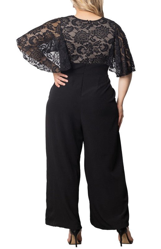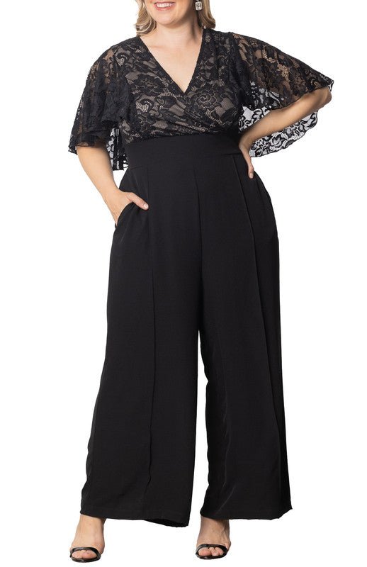 Elevate your wardrobe with the Plus Size Helena Lace Jumpsuit by Kiyonna. This sophisticated special occasion pantsuit features a lace surplice bodice, pockets, back zipper, flutter sleeves and a flattering pintuck along the flowy wide pant legs. An ideal option for the glam wedding guest or elegant mother of the bride or groom.