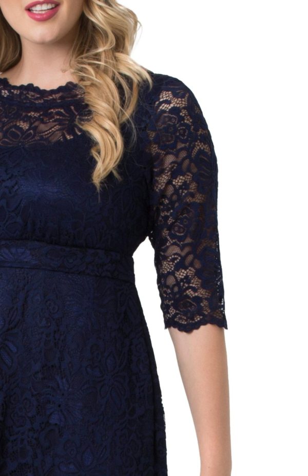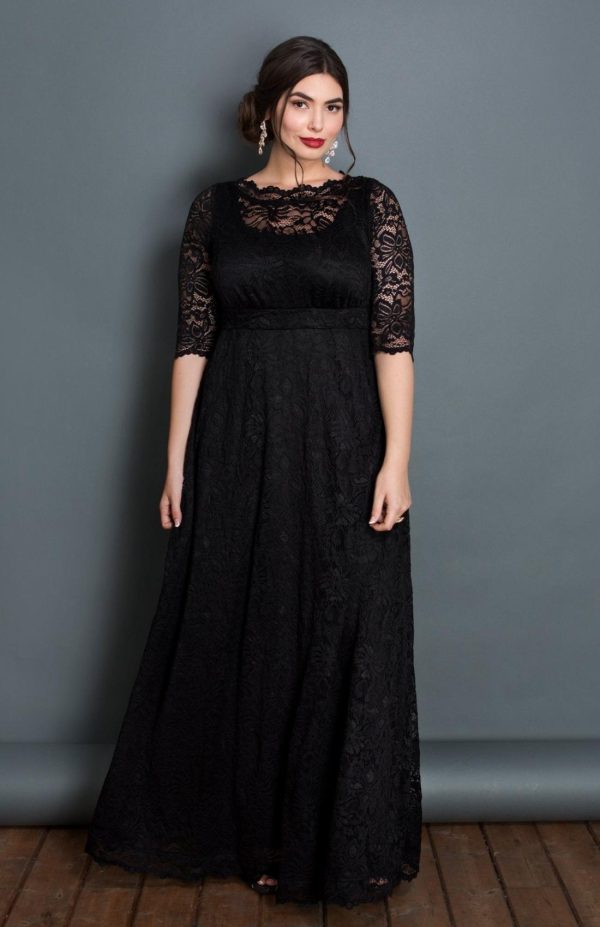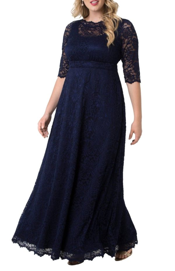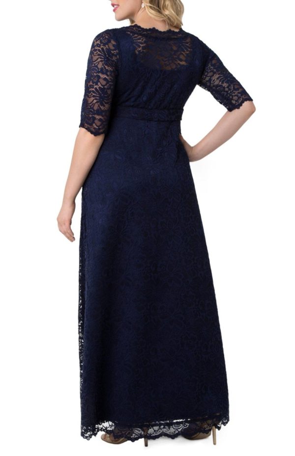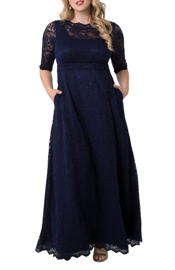 Our Leona Lace Long Formal Gown is a timeless special occasion dress with soft scalloped stretch lace, classic boat neckline, pull-over design, pockets, and 3/4 length sleeves. This floor length elegant evening gown is ideal for that best dressed wedding guest and mother of the bride / groom.