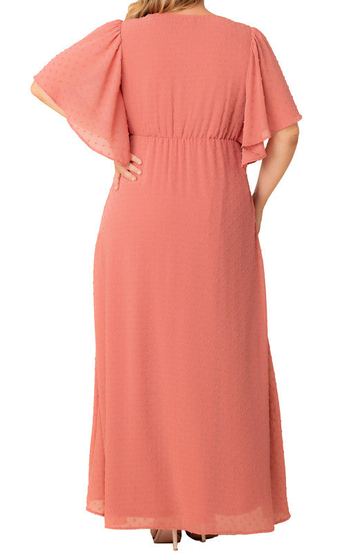 Epitomize understated elegance and look as pretty as a picture in the Carmella Flutter Sleeve Gown. This floor-length, plus-size long dress features a surplice neckline with a gathering detail at the bust which adds to the pageantry of this style. Elastic at the waistline emphasizes your body’s natural shapeliness, and the delicacy of the dress is complete with flutter sleeves sewn into the bodice.