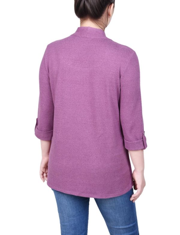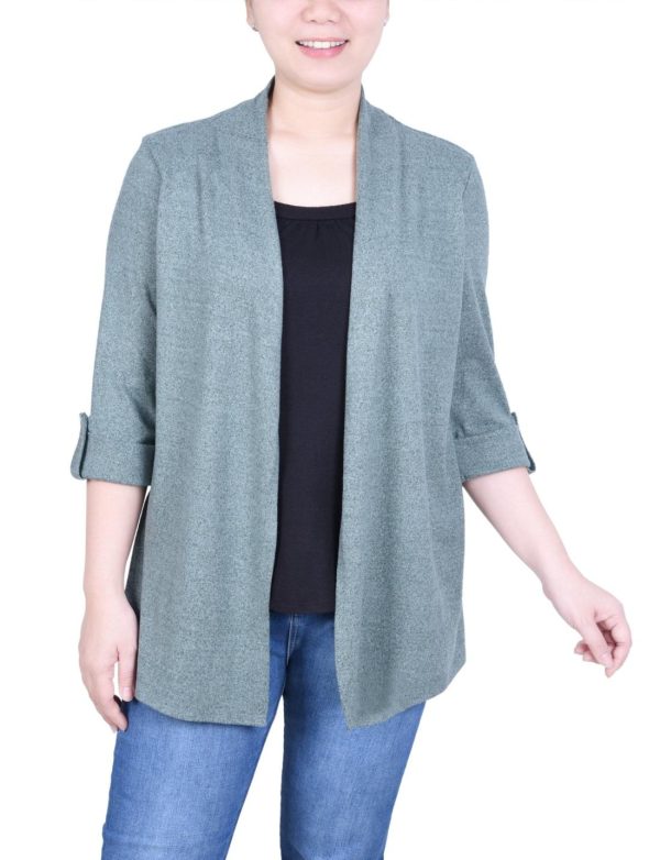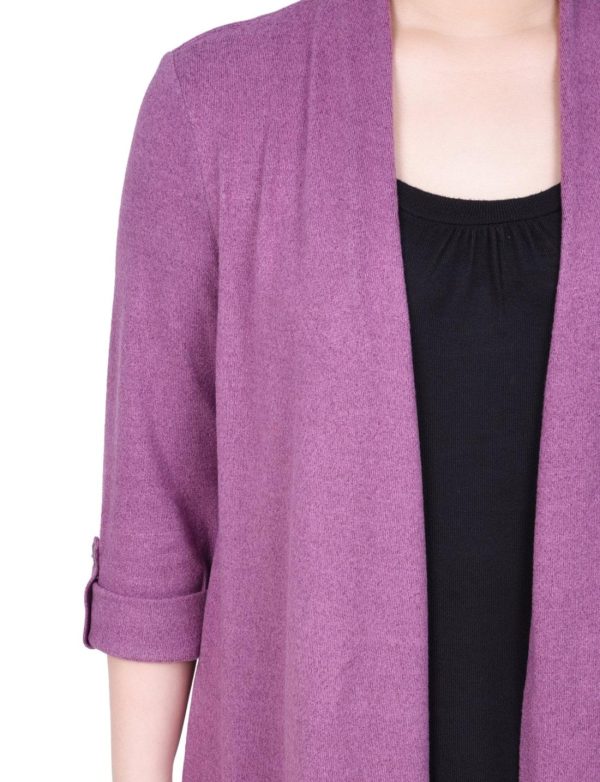 This 2-in-1 look is a necessity for any women’s wardrobe with a basic underlay and a 3/4 sleeve roll tab sleeve cardigan.