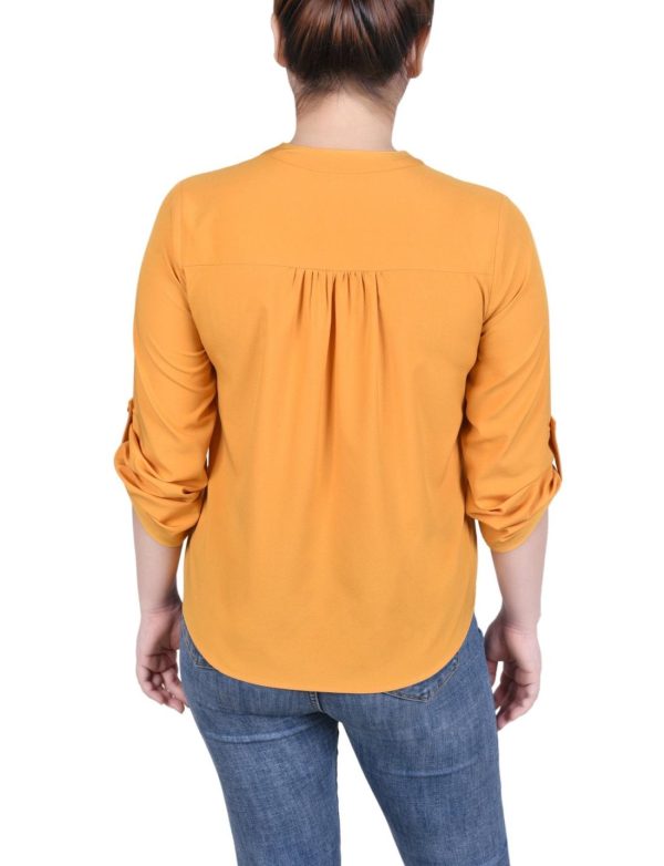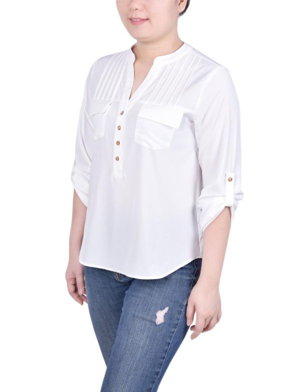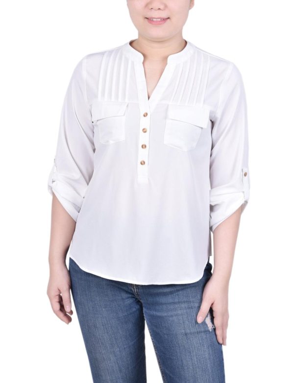 It’s all about the details on this blouse from NY Collection. The yoke features pintucks while the front has chest pockets with flaps. There are roll tab sleeves to make this blouse a year-round choice.