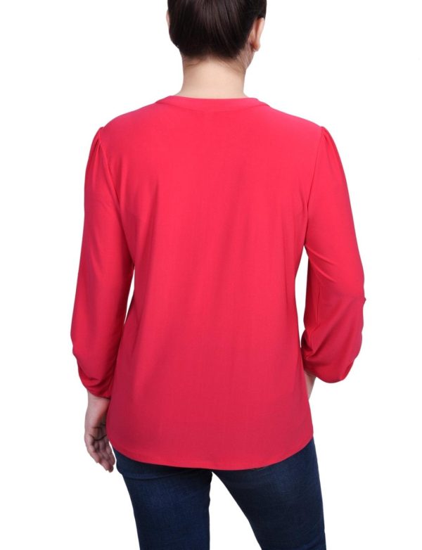 It’s all about the details on this jersey knit top from NY Collection. The front shoulders feature cutouts with a chain detail. There are pintucks down the front bodice. There are roll tab sleeves to make this blouse a year-round choice.