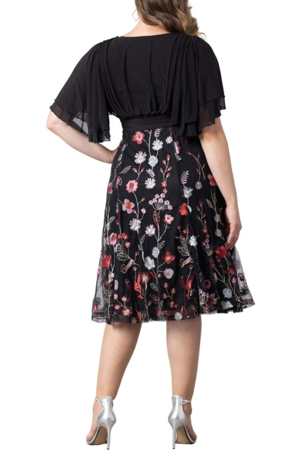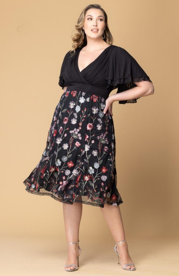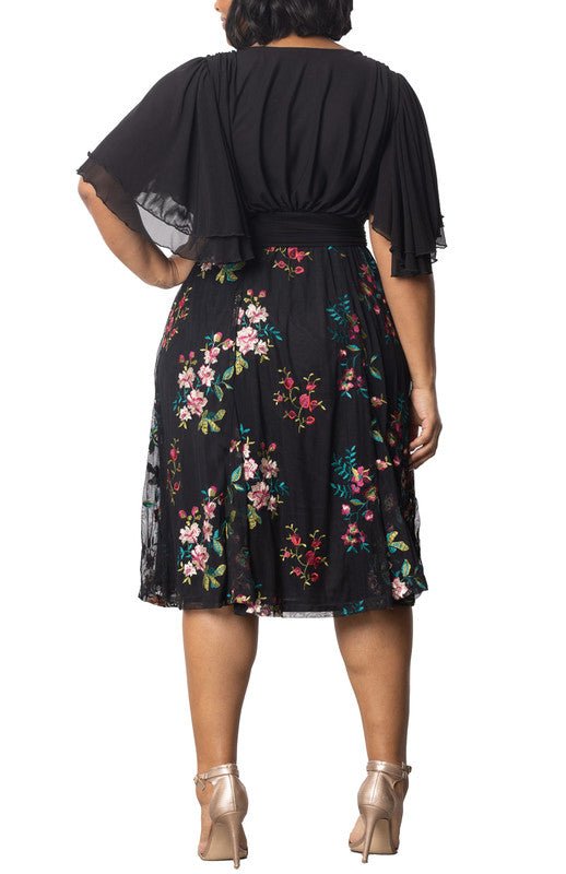 The Lillian Embroidered Cocktail Dress is a perfect plus size party dress, featuring a black mesh bodice, surplice neckline, double layer flutter sleeves and a softly shirred waistband. The floral embroidered skirt includes godets for flirty movement.