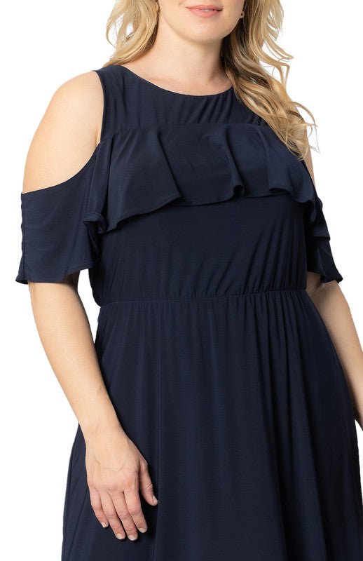 RSVP yes in our plus size Piper Cold Shoulder Maxi Dress. This flowy maxi dress features a softly defined elastic waist, flounce detailing at the hem, and a modest neckline with a flounce along the chest that transitions into cold shoulder sleeves. Made exclusively in women’s plus sizes.