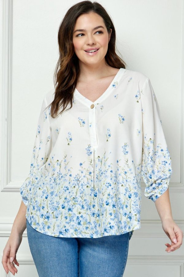 3/4 Button Tab Sleeve Big Button V-Neck Border Print Blouse in Border Print Poly Flex is a textured fabric with Spring Bloom print and colors, a perfect blouse for Spring & Summer.