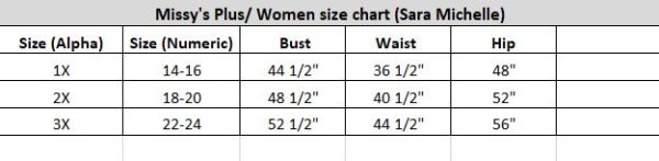 | Size | 0X, 1X, 2X, 3X, 4X, 5X |