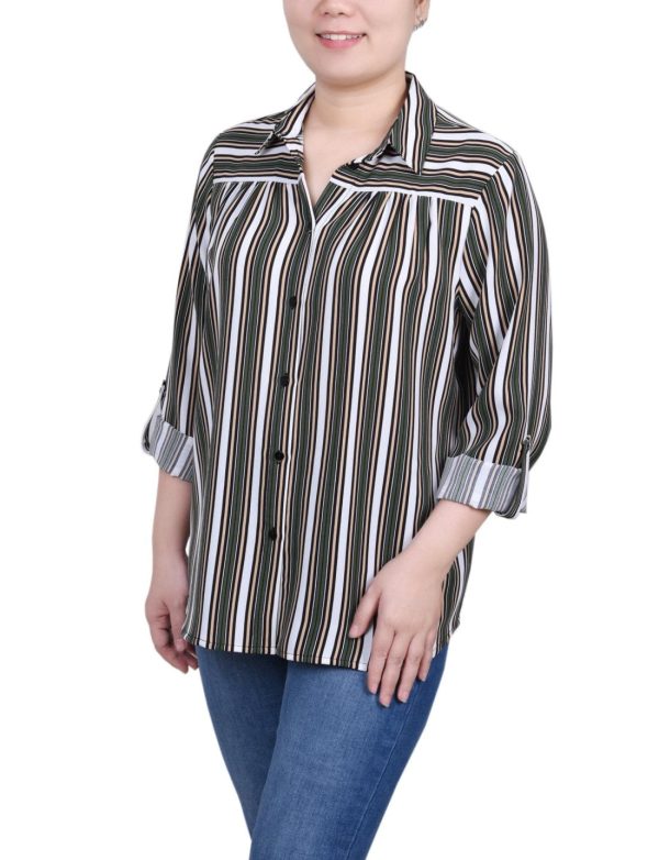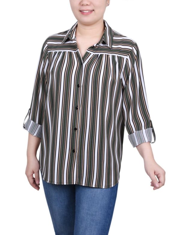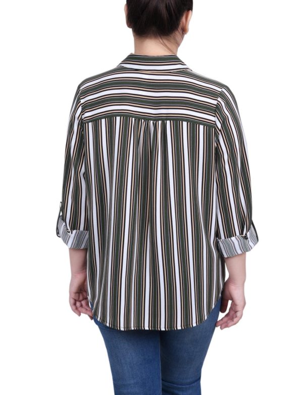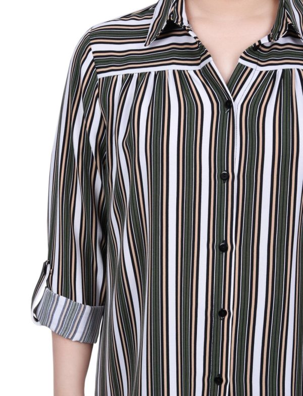 This Long Roll Tab Sleeve Blouse is perfect for any modern woman. Crafted with slightly textured fabric, the blouse features a point collar, yoke with gathers, long roll tab sleeves, and a rounded hemline for a timeless style. The stripe pattern brings flair to the timeless silhouette.